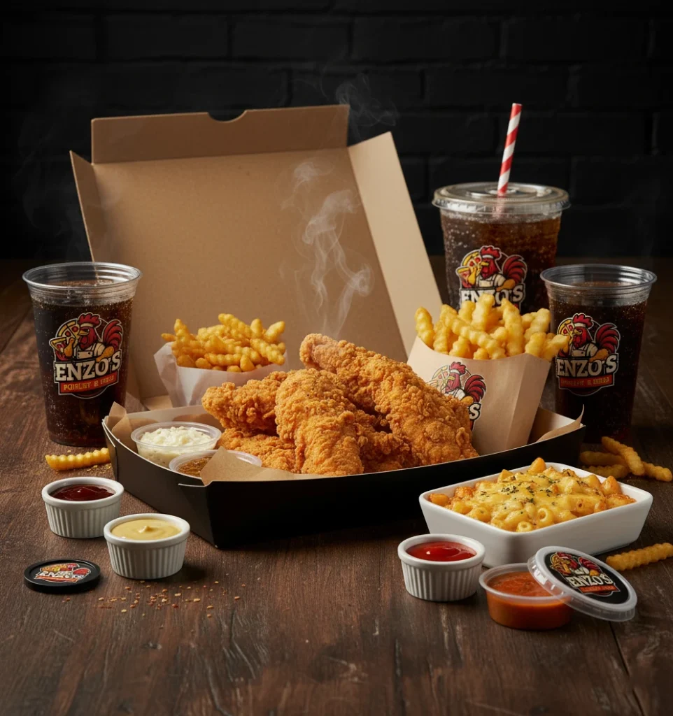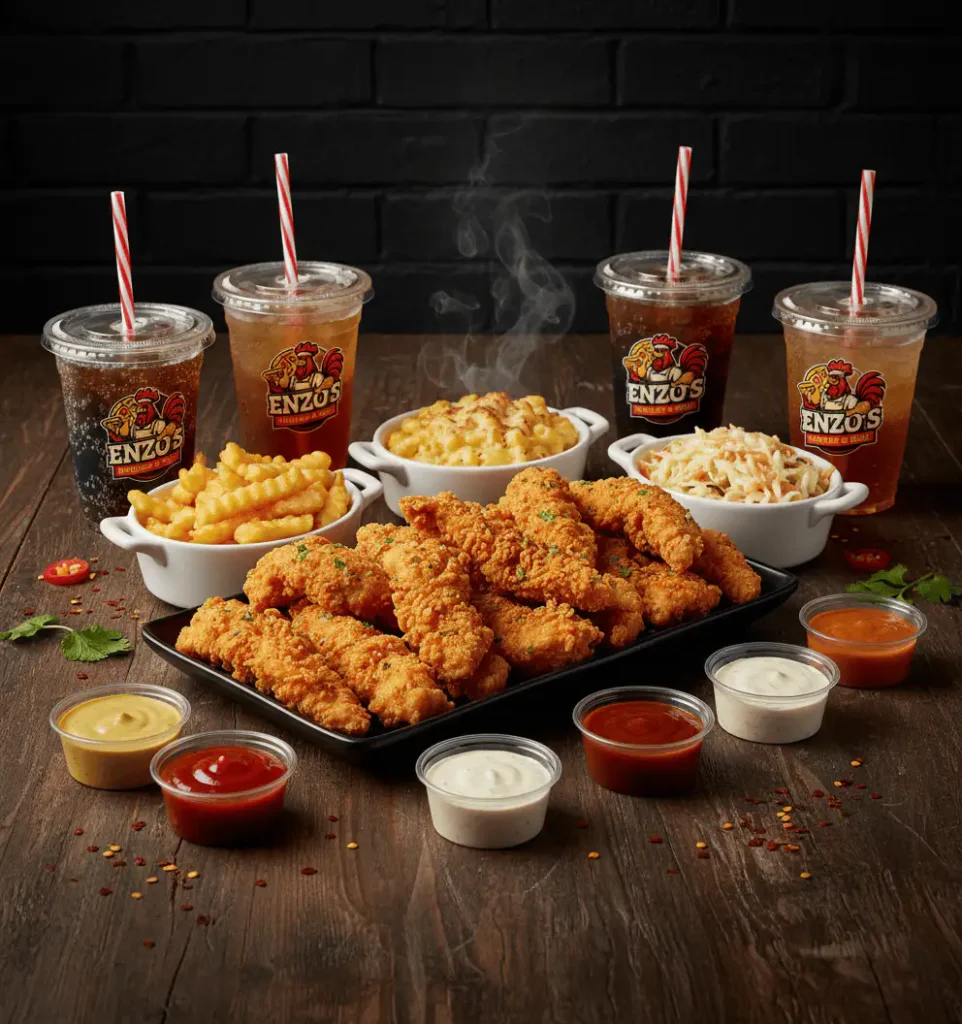 12 Tenders, 3 Sides (Fries, Mac & Cheese, Coleslaw), 6 Sauces to choose from, 4 Beverages