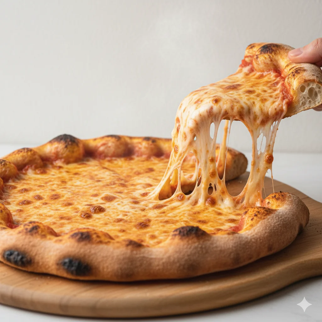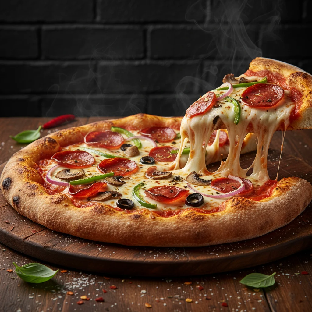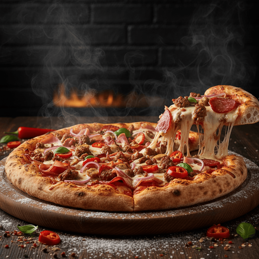 Ham, salami, beef, smoked meat, bacon, Italian sausage, hot peppers, red onions, mozzarella – a bold and indulgent creation.