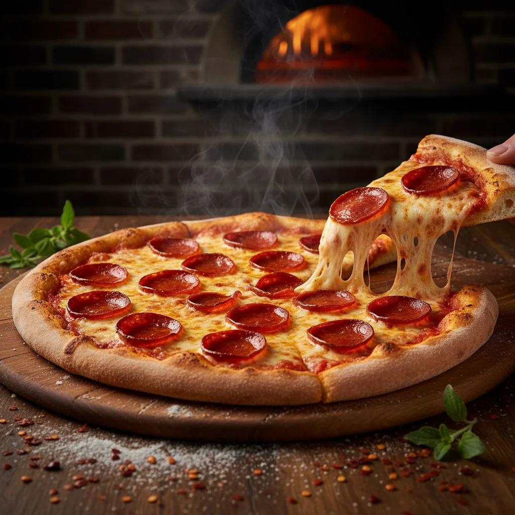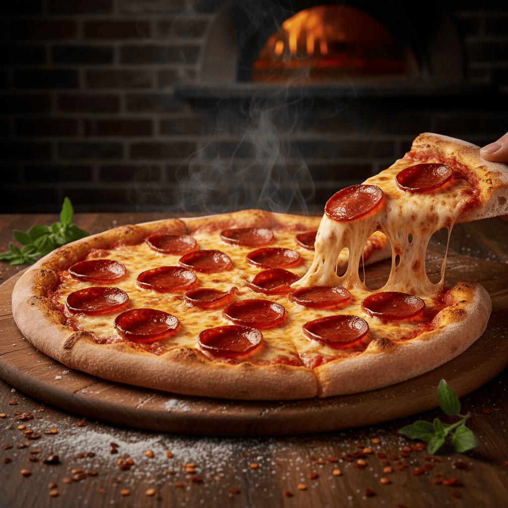 Tomato sauce, pepperoni, mushrooms, green peppers, onions, mozzarella – everything you love in one.