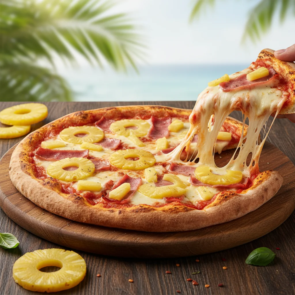 Tomato sauce, mozzarella, ham, pineapple – the perfect sweet and savoury combination.