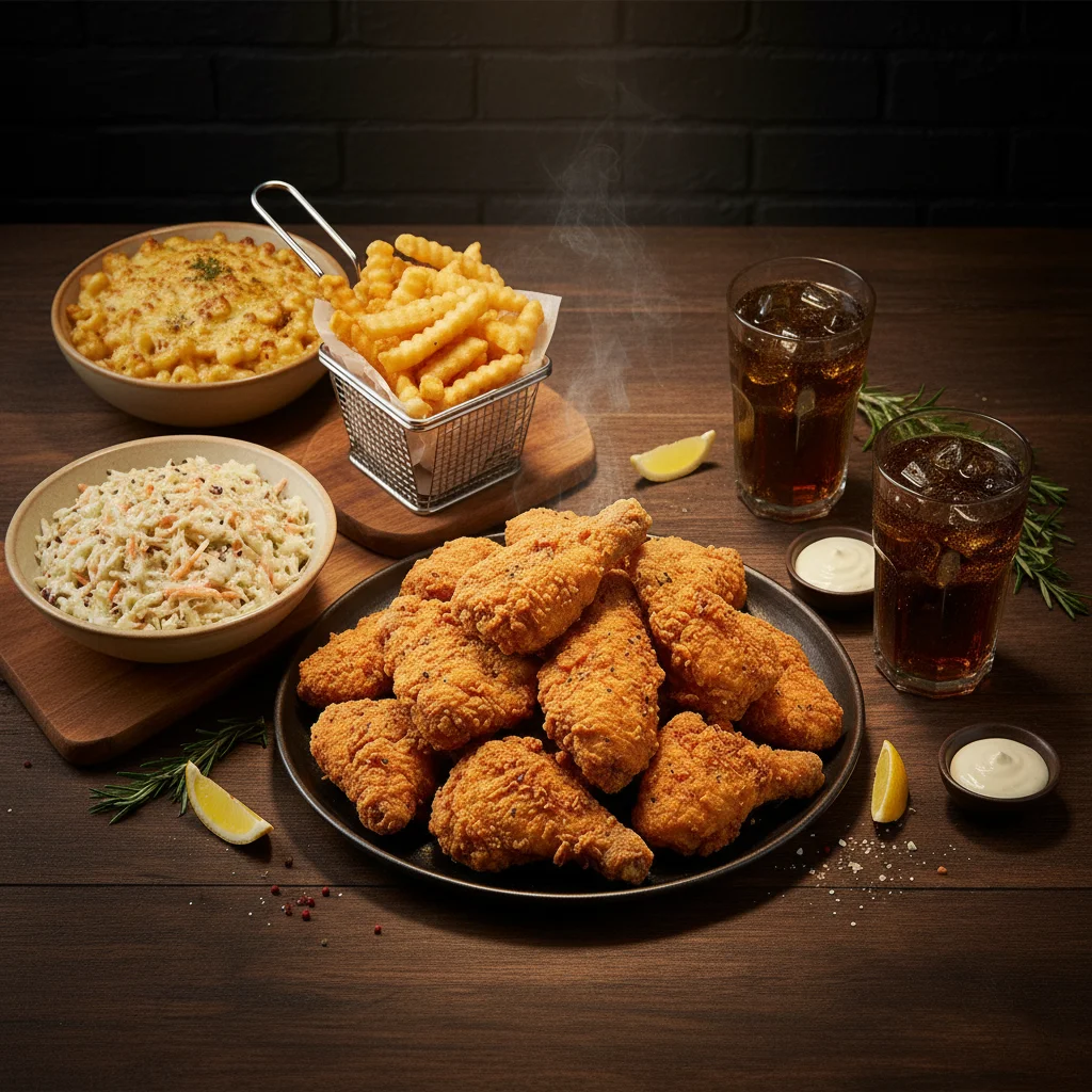 Includes 16 pieces of chicken, 3 large sides, and 6 drinks.